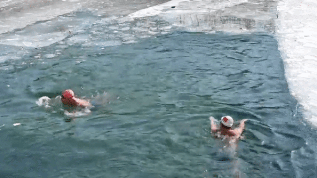 Bất chấp nhiệt độ ngoài trời được cảnh báo đã hạ xuống -11 độ C nhưng nhóm các cụ ông cao tuổi vẫn không bỏ thói quen luyện tập hàng ngày của mình là bơi trong hồ nước lạnh giá gần đóng băng.