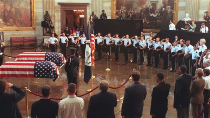 Cảnh sát Điện Capitol thực hiện nghi thức chào trước linh cữu đặc vụ John Gibson và sĩ quan Jacob Chestnut ngày 28/7/1998. Hai người này thiệt mạng trong vụ nổ súng ngày 24/7 tại Nhà Quốc hội. Ảnh: AFP/Getty Images.