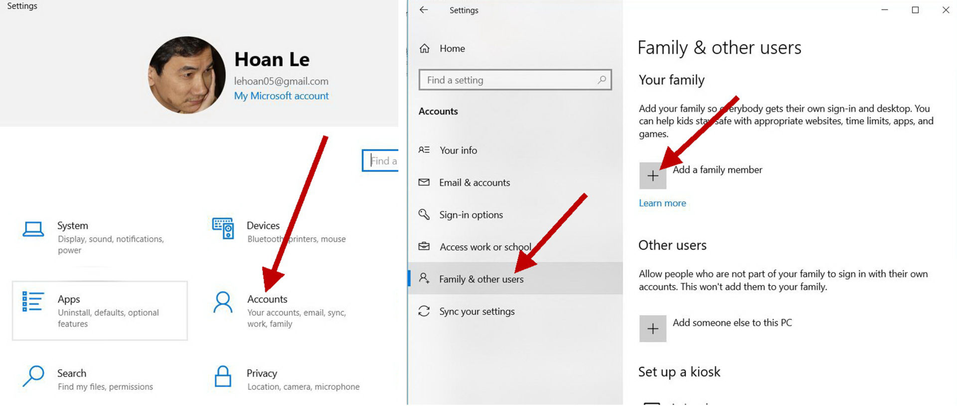-Trong danh sách các thiết lập trong khung bên trái, bạn bấm lên mục Family & other users rồi chuyển qua khung bên phải và bấm lên dấu + của mục Add a family member.