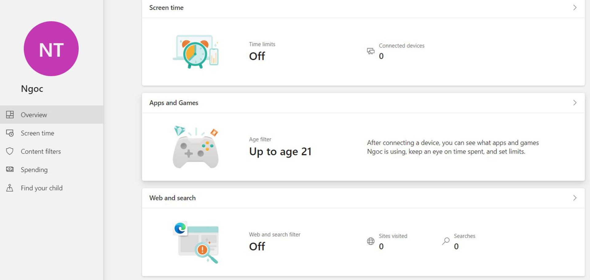 Microsoft đã tích hợp sẵn chức năng Parental Controls vào Windows 10 để giúp các bậc phụ huynh có thể kiểm soát được thời gian sử dụng máy tính, theo dõi chi tiết quá trình lướt web, học tập và chơi game của trẻ. Bảo đảm trẻ em luôn được bảo vệ mỗi khi chúng truy cập mạng.