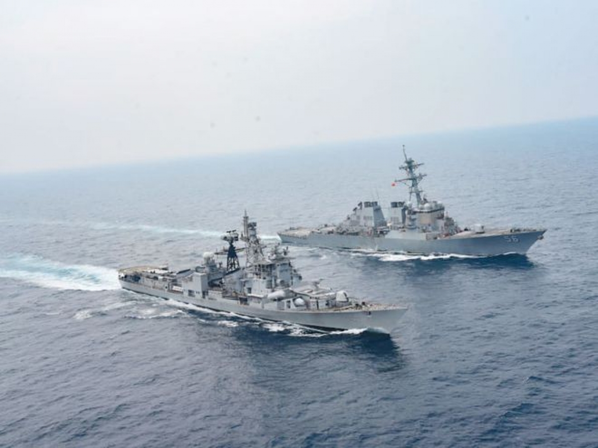 Tàu khu trục USS John S.McCain (Mỹ) và tàu khu trục INS Ranvijay của Ấn Độ trong cuộc tập trận Malabar. Ảnh: ANI
