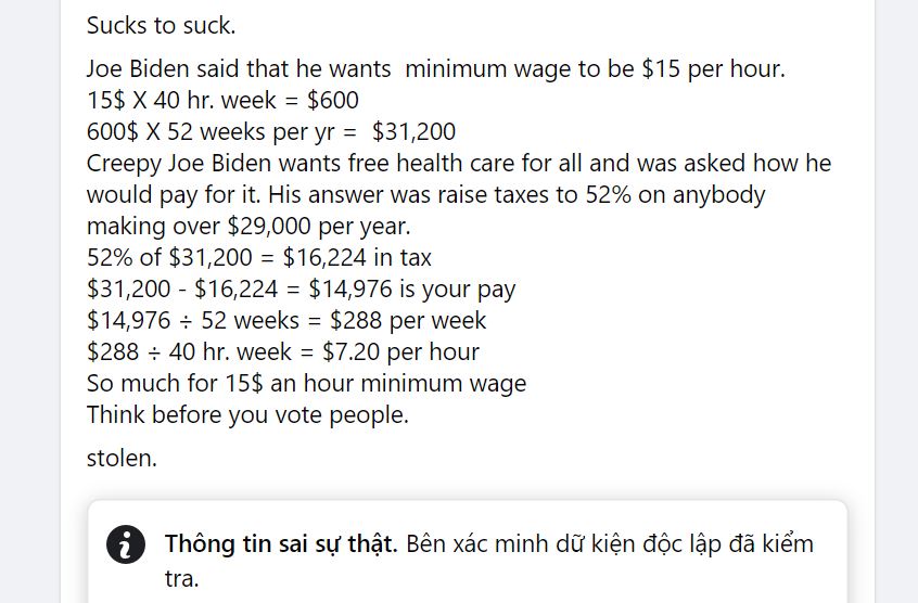 Sau đó, những người này tự tiện “chụp mũ” là ông Biden đánh thuế 52% người có thu nhập thấp.