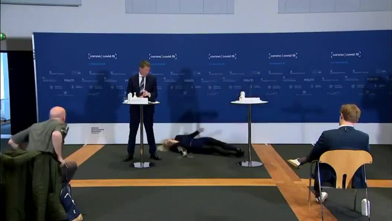 Bà Tanja Erichsen, quan chức cơ quan quản lý dược phẩm Đan Mạch, ngất xỉu và đổ gục trong buổi họp báo tuyên bố dừng hẳn tiêm vaccine AstraZeneca.