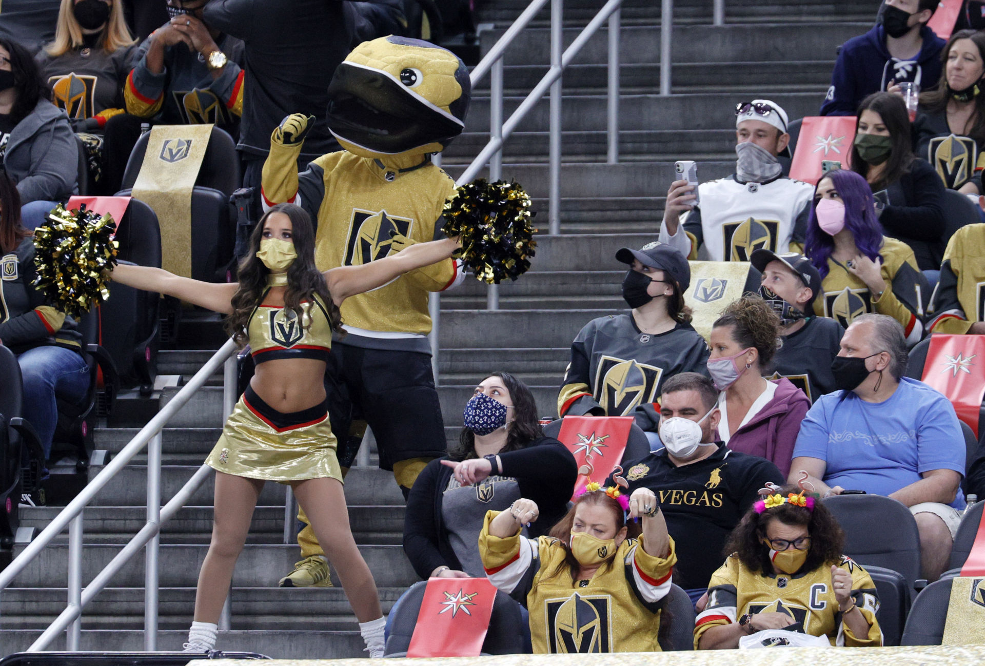 Khán giả đeo khẩu trang khi đến dự buổi tranh tài khúc côn cầu trên băng (ice hockey) ở Las Vegas, Nevada. (Hình: Ethan Miller/Getty Images)