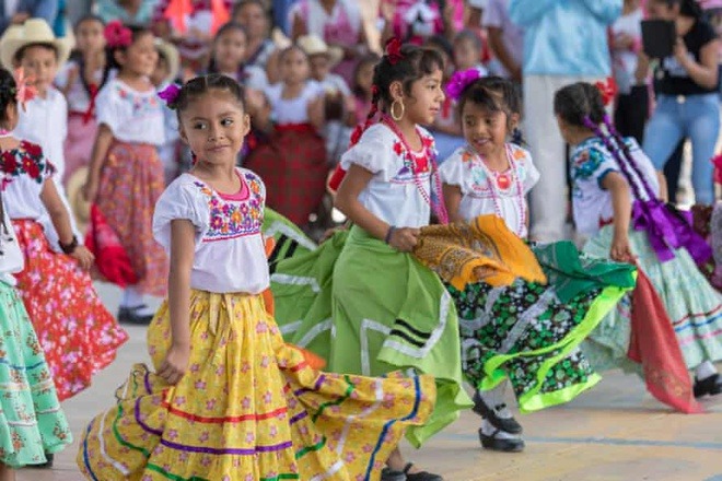Trẻ em trong trang phục truyền thống có họa tiết được tạo ra bởi cộng đồng ở Mexico. Ảnh: Jim West.
