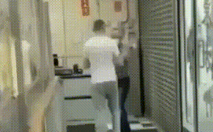 Mọi chuyện tưởng như chỉ kết thúc ở đó, khi anh ta đã bị đẩy ra khỏi cửa. Tuy nhiên, nam thanh niên này tiếp tục tỏ rõ sự ăn thua, quay lại cửa hàng và định tấn công tiếp 2 người đàn ông kia. Có vẻ anh ta không chịu bỏ cuộc. Người ta nghe thấy anh ta nói rằng: "Cứ đá tôi đi và tôi sẽ cho cái mặt của ông dán vào bức tường đằng kia".
