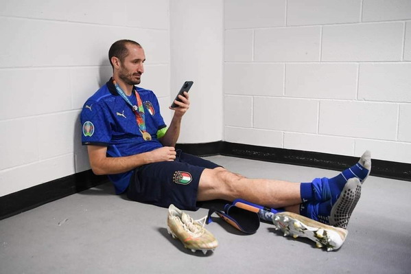 Phút bình yên sau chiến thắng của người cận vệ già. Có thể anh đang check tin nhắn của gia đình, có thể anh đang xem người dân Italia ăn mừng nơi quê nhà như thế nào, cũng có thể anh đang xem lại những khoảnh khắc trong trận chung kết vất vả vừa qua mà anh là một trong hai điểm tựa vững chãi cho đội bóng màu Thiên Thanh. Tuyệt vời Chiellini
