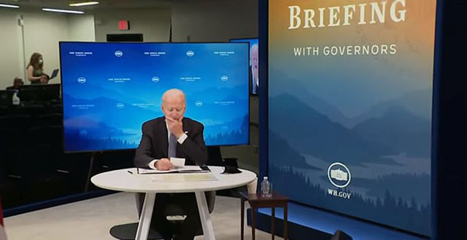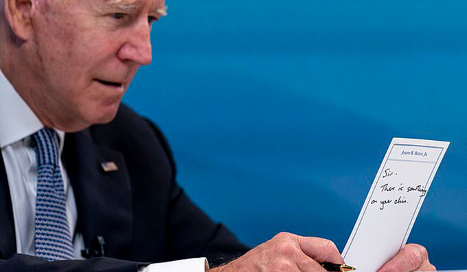 Thông thường, các trợ lư của ông sẽ chỉ can thiệp khi bắt đầu nhận các câu hỏi từ báo chí nhằm tránh nguy cơ đi sai kịch bản. Ban đầu, người ta không biết tờ ghi chú ở đầu chương tŕnh ông Biden nhận được là ǵ. Tuy nhiên, khi ông Biden sử dụng chính tờ giấy này để ghi nội dung cuộc họp và giơ nó lên, cả thế giới biết ông được nhắc v́ "có thứ ǵ đó trên cằm".
