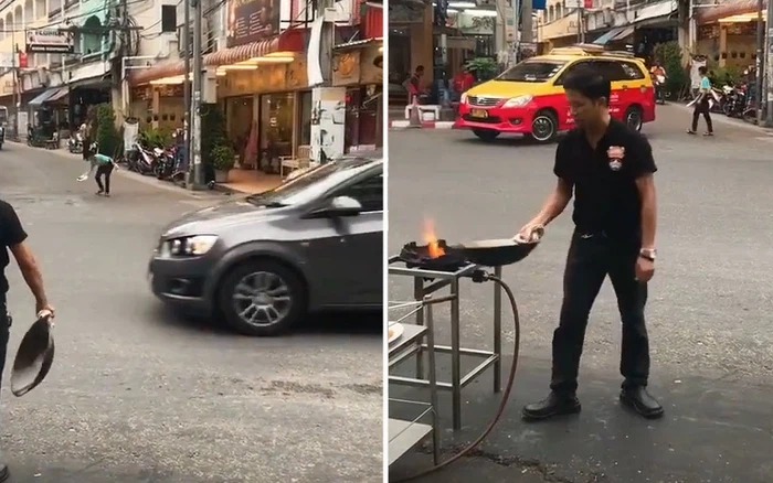 Quả thật, đây không còn là nấu ăn bình thường nữa rồi, mà phải gọi là cao thủ. Ở bên này, một người tung hứng chảo rau lên, rau muống xào lập tức bay lên không trung theo hướng nhân viên đang đứng đợi. Bên kia đường, cách 1 ngã tư, xe cộ đang qua lại tấp nập, anh nhân viên cầm đĩa đứng chờ. Chỉ cần số rau muống bay tới nơi là đưa ra đỡ, thậm chí còn tung thêm 1 lượt nữa cho rau nằm gọn gàng, đẹp mắt trong chiếc đĩa. Và giờ thì mang lên cho khách thôi!