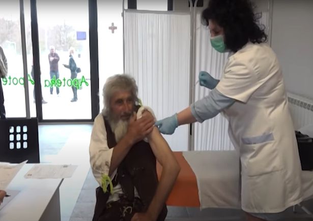 Ông Panta Petrovic, người sống 20 năm trong hang động ở Serbia, xuống núi để tiêm vắc xin Covid-19. Ảnh: Daily Star