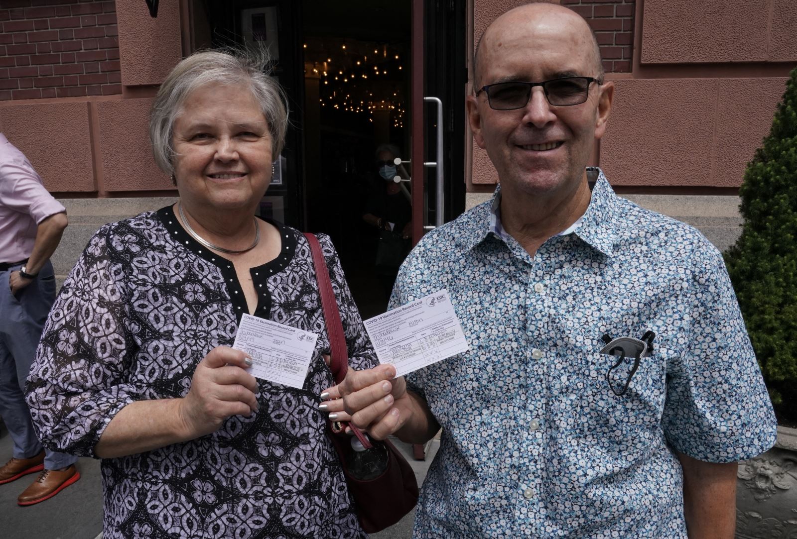Người dân trình chứng nhận đã tiêm vaccine ngừa COVID-19 khi vào một nhà hàng ở New York, Mỹ ngày 17/8/2021. Ảnh: AFP/TTXVN