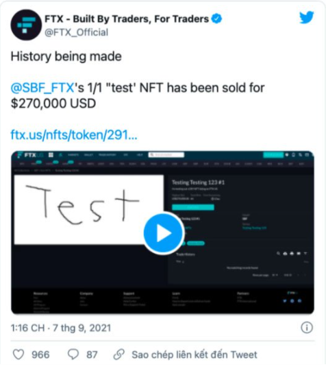 Một bản viết tay thử nghiệm với duy nhất chữ "Test" nguệch ngoạc dưới dạng NFT đã được bán trên sàn FTX với giá 270.000 USD, (6 tỷ đồng). Điểm đặc biệt của chữ Test này không nằm ở giá trị nghệ thuật mà bởi nó được viết bởi tỷ phú Sam Bankman-Fried. Nhà sáng lập kiêm CEO FTX Exchange.