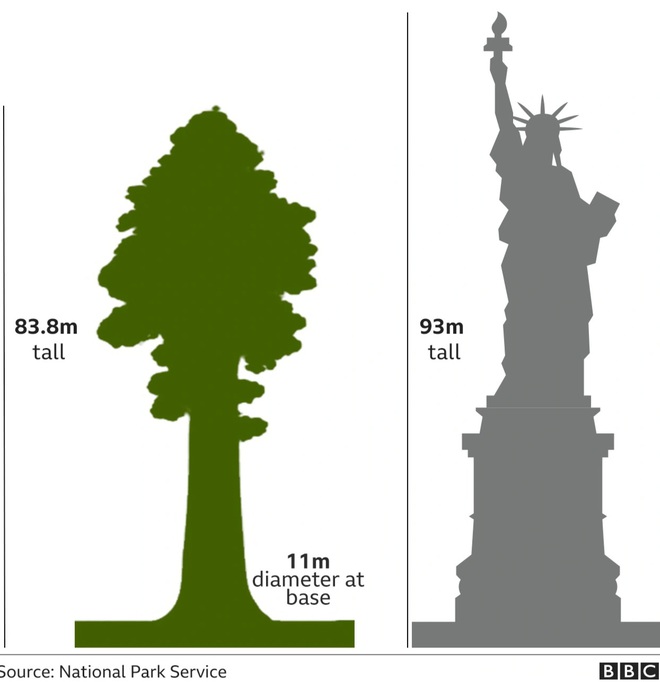 Chiều cao của cây cổ thụ lớn nhất thế giới General Sherman với tượng Nữ thần Tự do ở New York (Ảnh: BBC).