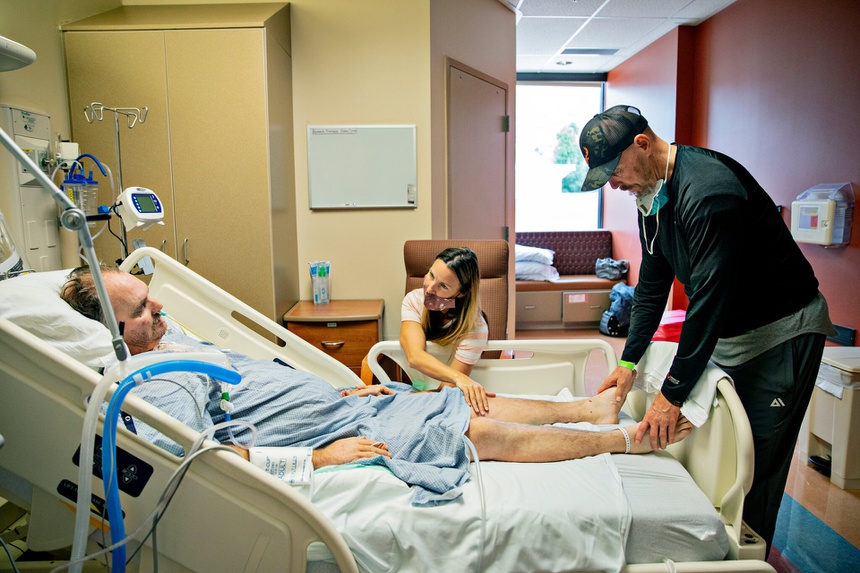 Mindy Greene (giữa), sống tại Utah, vào thăm chồng bị nhiễm Covid-19. Vợ chồng cô đã từ chối tiêm chủng vì không tin vào vaccine. Ảnh: Kim Raff/New York Times.
