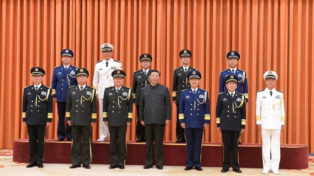 Chủ tịch Quân ủy Trung ương Trung Quốc Tập Cận Bình tại buổi lễ thăng quân hàm cấp tướng cho 5 sĩ quan quân đội cấp cao vào tháng 9/2021. Ảnh: CGTN