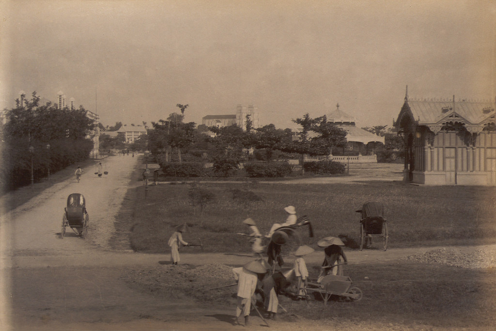 Bên bờ hồ Hoàn Kiếm, Hà Nội thập niên 1890. Nhà thờ Lớn (xây năm 1884-1886) nằm bên kia bờ hồ, góc trái. Ảnh: Bunum.univ-cotedazur.fr. Ảnh: Tư Liệu