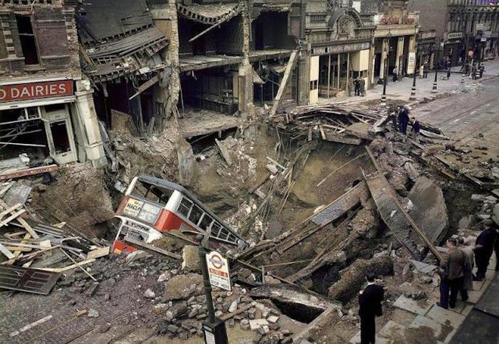Một góc London bị thiệt hại lớn sau các cuộc ném bom của Đức quốc xã. Trùm phát xít Hitler phát động cuộc chiến với Anh nhằm chiếm đóng nước này, bành trướng lãnh thổ.