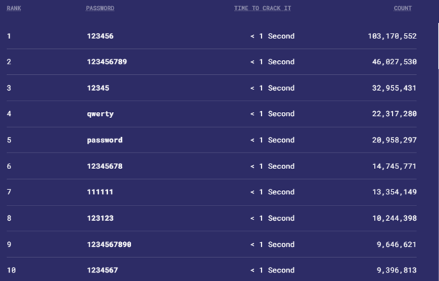 Bên cạnh phần thứ hạng (Rank) và Mật khẩu (Password), còn 2 thành phần mà người đọc cần lưu tâm đó là Thời gian bẻ khóa (Time to crack it) và Số lượng (Count). Cụ thể, thời gian bẻ khóa là khoảng thời gian minh họa mà hacker có thể bẻ khóa mật khẩu đó, những mật khẩu được đặt theo quy luật sẽ có thời gian bẻ khóa nhanh hơn so với mật khẩu đặt ngẫu nhiên. Trong khi đó, số lượng ám chỉ số lần mật khẩu được sử dụng.