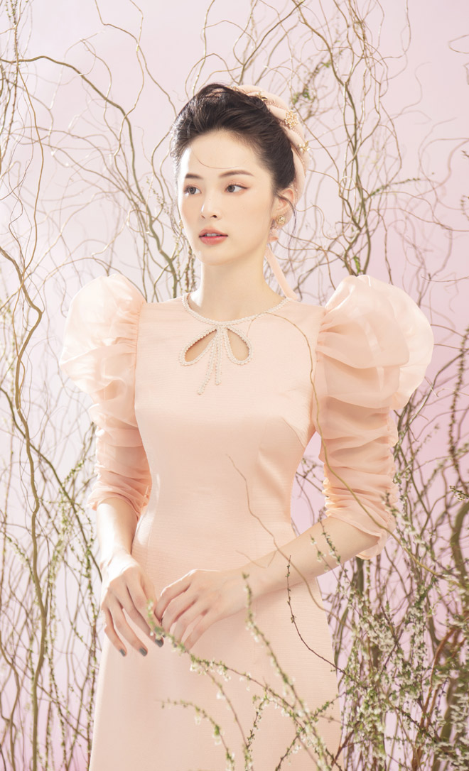 Được nhà thiết kế "chọn mặt gửi vàng", Hạ Vi "biến hóa" khi trong veo tựa hạt sương sớm mai, khi rạng ngời như đóa hoa xuân đang nở rộ.