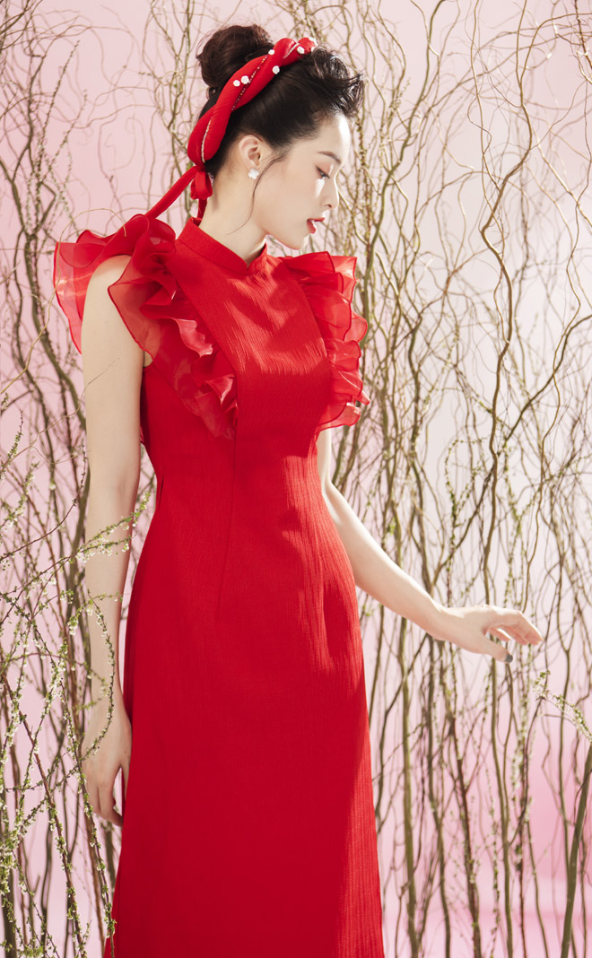 Hạ Vi đầy sức sống cùng chiếc áo dài màu đỏ, đậm không khí lễ hội. Đỏ luôn là tông màu sang trọng và rực rỡ, mang đến sự may mắn nên thích hợp diện những ngày đầu năm.
