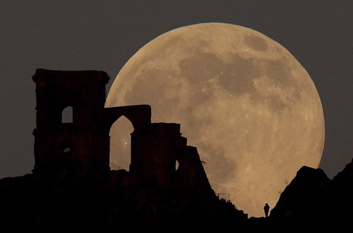 Khoảnh khắc một người đứng trên sườn đồi Glastonbury Tor ngắm Trăng tròn. Ảnh: Toby Melville / Reuters.