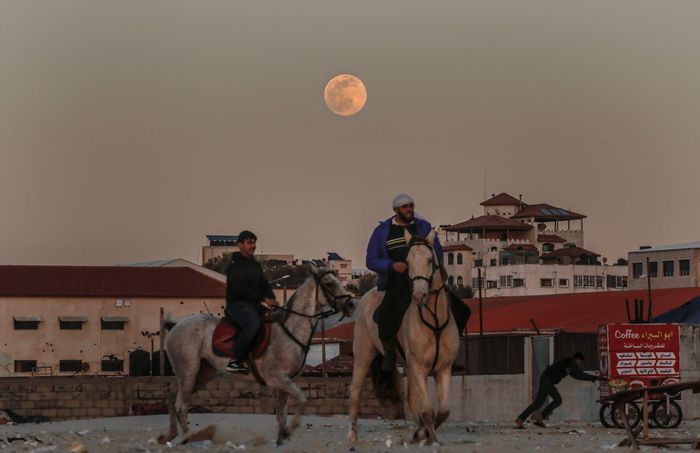Người dân Palestine cưỡi ngựa dọc bãi biển Gaza khi Trăng Rằm mọc. Ảnh: Sameh Rahmi / NurPhoto / Rex / Shutterstock.
