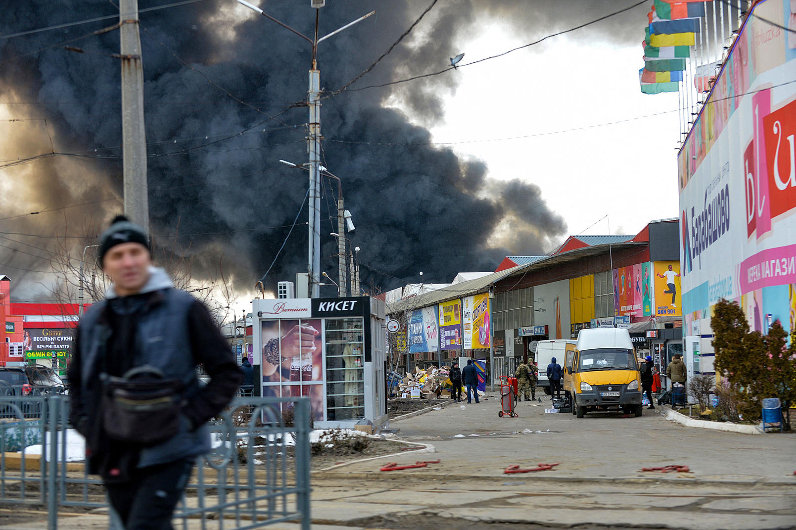 Khói đen bốc lên từ chợ Barabashovo ở thành phố Kharkiv thứ Năm, ngày 17 tháng 3, 2022, sau khi chợ bị trúng những trái hỏa tiễn của Nga. Đây là ngôi chợ lớn nhất Ukraine, rộng 75 mẫu hecta và có nhiều cửa hàng của người Việt Nam. (Sergey Bobok/ AFP via Getty Images)