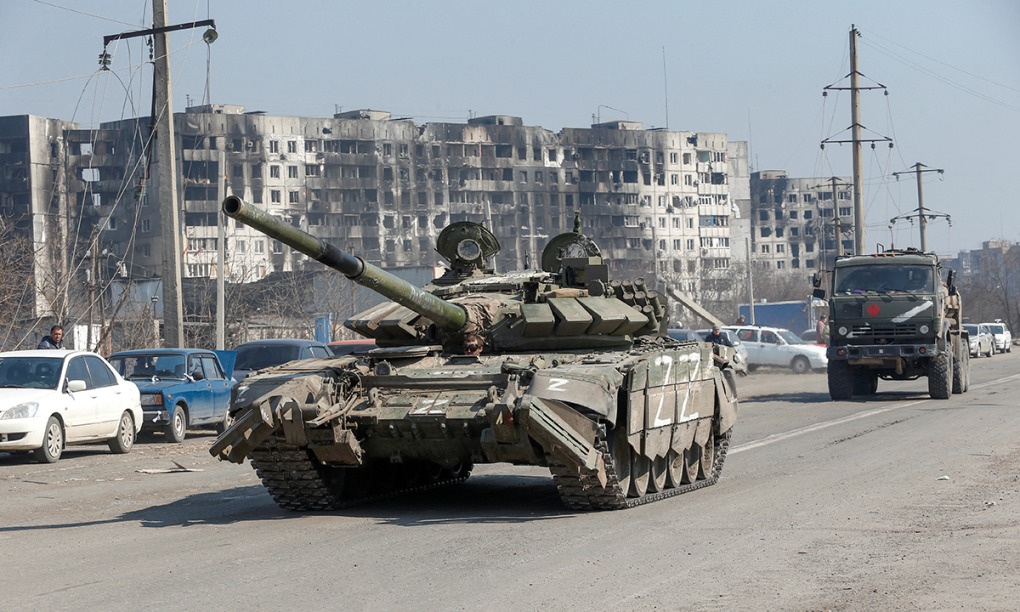 Xe tăng của lực lượng ly khai thân Nga trên đường phố Mariupol, đông nam Ukraine ngày 5/4. Ảnh: Reuters.