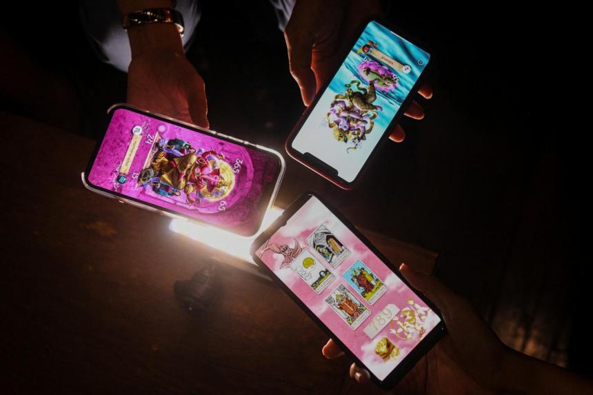 Điện thoại cài hình nền là những lá bài chiêm tinh. Ảnh: Reuters