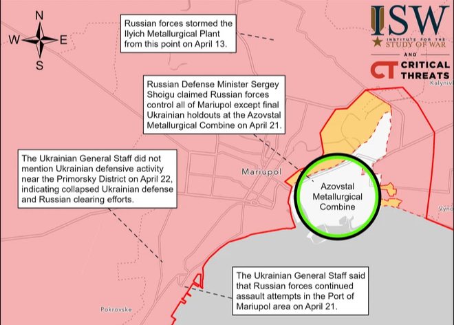 Đồ họa được các tổ chức ISW và CT của Mỹ đưa ra cho thấy tình hình ở Azovstal tính tới cuối ngày 22/4.