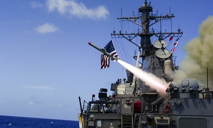 Tên lửa chống hạm Harpoon được phóng từ khu trục hạm USS Fitzgerald của Mỹ trong cuộc tập trận tháng 3/2016 gần đảo Guam phía nam Thái Bình Dương. Ảnh: Hải quân Mỹ.