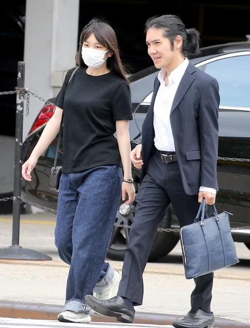 Mako Komuro, 30 tuổi, con gái cả của vợ chồng Thái tử Nhật Fumihito, lựa chọn trang phục giản dị để dạo phố. Cô mặc áo phông đen và quần jean dáng rộng kết hợp đi giày thể thao. Trong khi đó chồng cô, Kei Komuro, mặc bộ vest lịch sự, dường như anh đang chuẩn bị đi làm.