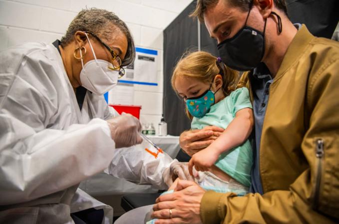 Một bé gái hai tuổi được tiêm vaccine Moderna vào chân tại Quảng trường Thời đại ở Mỹ, tháng 6/2022. Ảnh: NY Times