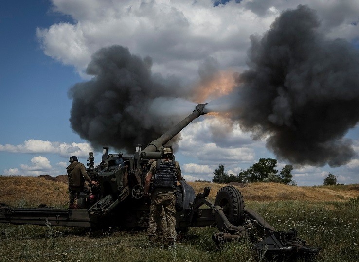 Quân nhân Ukraine khai hỏa lựu pháo FH-70 tại một tiền tuyến ở vùng Donbass. (Nguồn: Reuters)