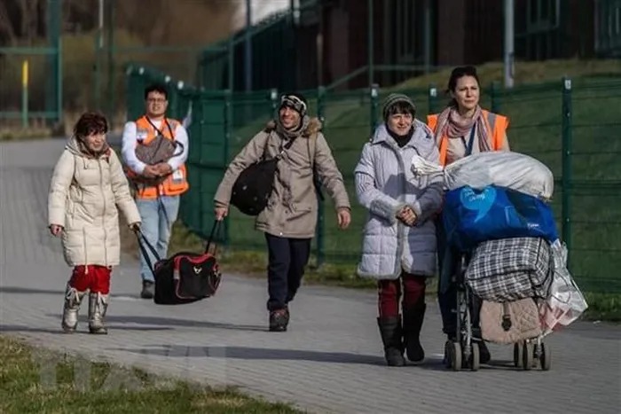 Người dân Ukraine sơ tán tránh xung đột sang Medyka, Ba Lan. (Ảnh: AFP/TTXVN)