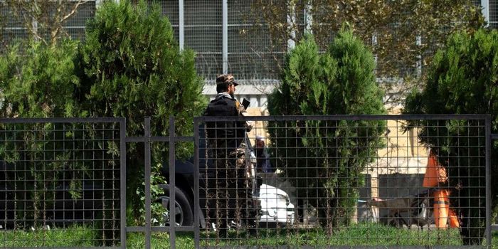 Lực lượng Taliban gác bên ngoài Đại sứ quán Nga tại thủ đô Kabul, Afghanistan sau vụ đánh bom ngày 5/9. Ảnh: AFP.