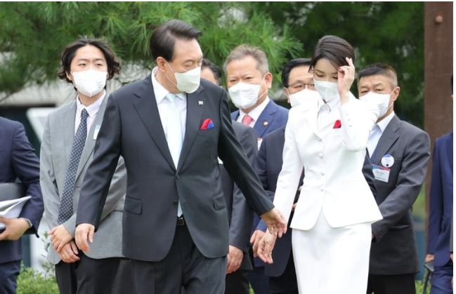 Đệ nhất phu nhân Kim Keon Hee dự lễ kỷ niệm Ngày Giải phóng Quốc gia lần thứ 77 cùng chồng là Tổng thống Yoon Suk Yeol. Ảnh: Korea Times.