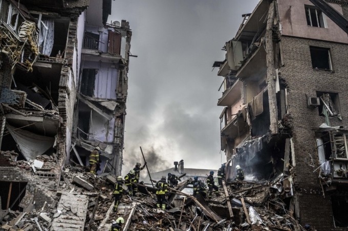 Lính cứu hỏa Ukraine tại hiện trường các ṭa nhà bị phá hủy do không kích ở thành phố Zaporizhzhia ngày 10/10. Ảnh: AFP.