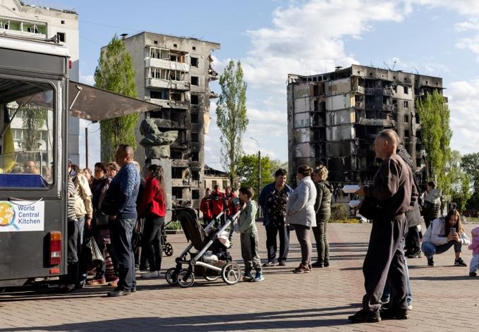 Người dân xếp hàng nhận đồ ăn ở Borodyanka, ngoại ô Kiev, Ukraine, hôm 16/5. Ảnh: Reuters.