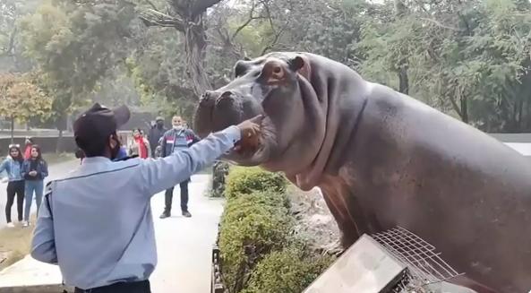 Một nhân viên bảo vệ nhanh trí dũng cảm lại gần con vật và đánh nhẹ vào đầu con hà mã, như ra hiệu cho nó phải trở lại chuồng vì đã vượt qua ranh giới.