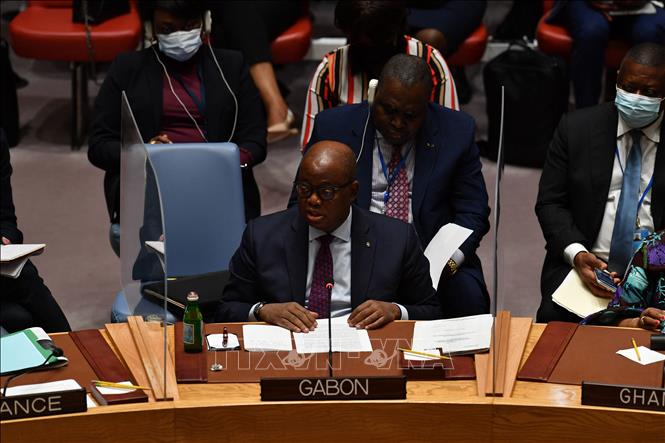 Ngoại trưởng Gabon Michael Moussa Adamo (giữa) dự cuộc họp cấp Bộ trưởng của HĐBA LHQ về xung đột và an ninh lương thực, hòa bình và an ninh quốc tế, tại New York, Mỹ, ngày 19/5/2022. Ảnh tư liệu: AFP