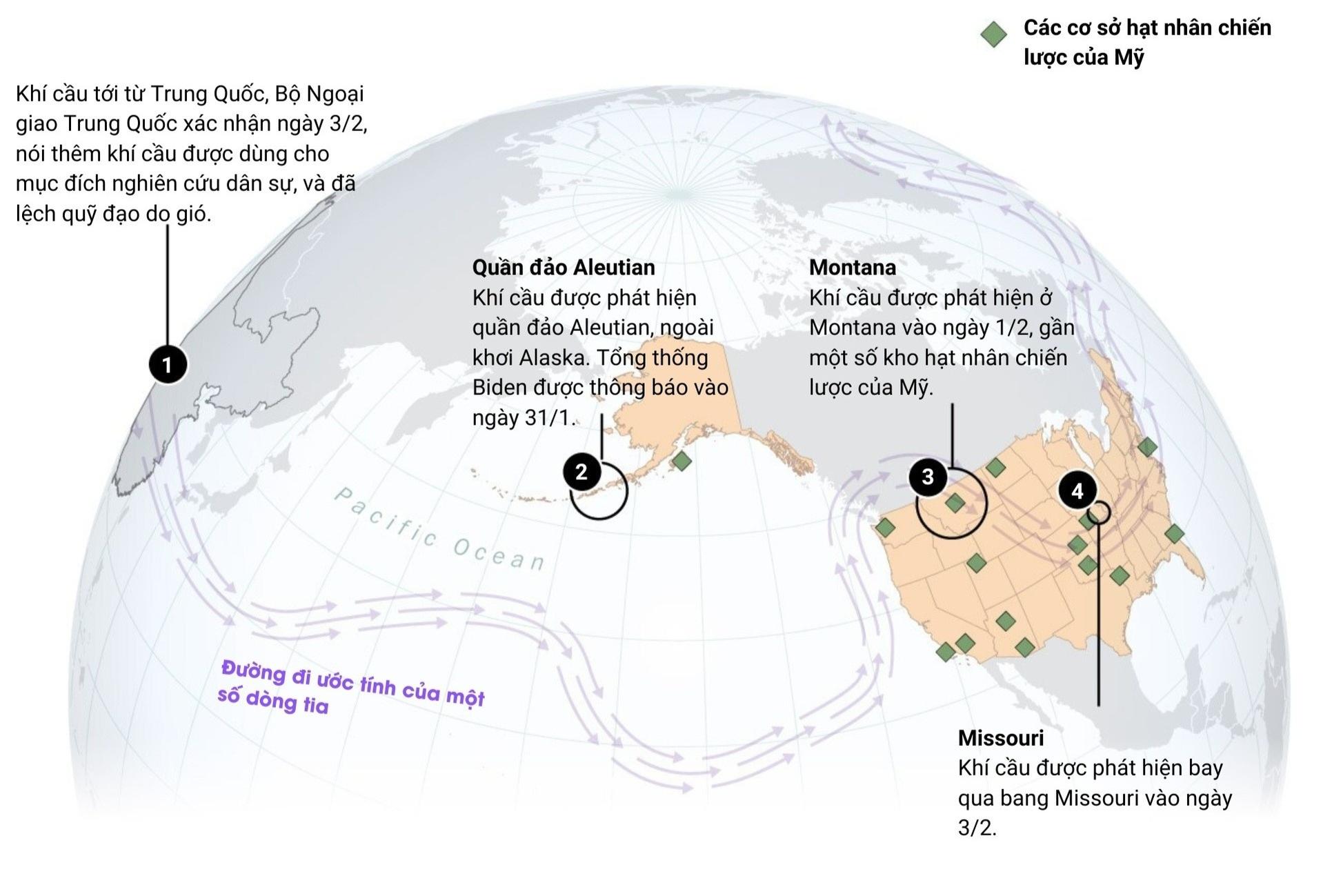 Hành trình của khinh khí cầu Trung Quốc trước khi tiến vào không phận Mỹ. Đồ họa: Washington Post. Việt hóa: Trần Hoàng.