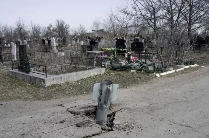 Phần đuôi chưa nổ của một quả tên lửa 220mm chứa bom chùm được phóng từ bệ phóng tên lửa đa năng BM-27 Uragan tại một nghĩa trang ở Mykolaiv, miền nam Ukraine, vào ngày 21 tháng 3 năm 2022. Ảnh: Getty