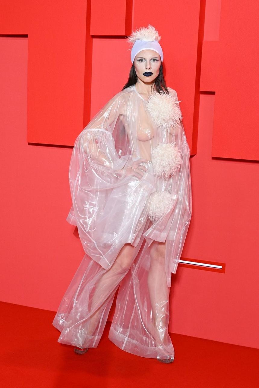 Trước đó, trên thảm đỏ Cannes 2023, Julia Fox cũng diện chiếc váy trễ vai được làm từ nhựa. Lớp nhựa trong để lộ váy lưới cúp ngực phía bên trong.