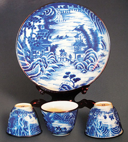 Bộ đồ trà xuân - thu ẩm, vẽ phong cảnh sơn thủy. Đồ sứ kí kiểu đời Hoàng đế Minh Mạng.