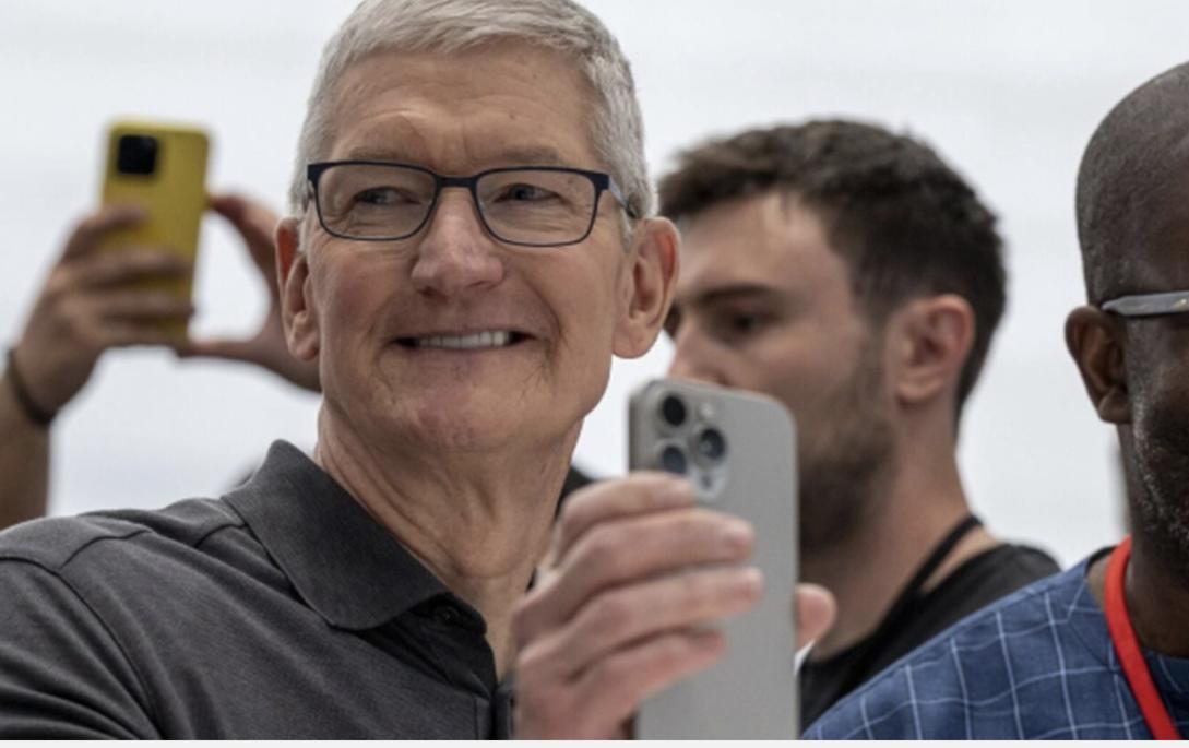 CEO Apple Tim Cook với một chiếc iPhone 15 Pro Max trên tay trong sự kiện ra mắt hôm 12/9, tuy nhiên sẽ không có người dùng nào cầm mẫu smartphone theo cách này (Ảnh: Bloomberg)
