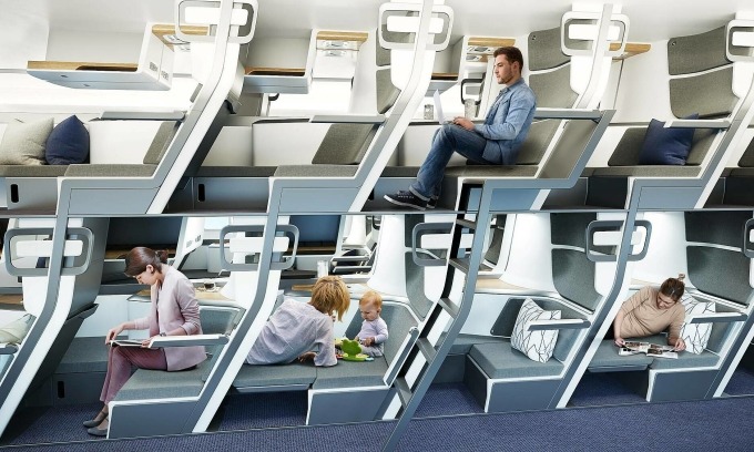 Theo thiết kế này, hai khách sẽ ngồi chung một hàng, được cách biệt bởi tầng trên và tầng dưới. Chỗ ngồi sẽ cần sắp xếp theo cấu hình 2-4-2, cho phép các hãng bay duy trì được số lượng chỗ ngồi mà không làm mất đi sự thoải mái của hành khách