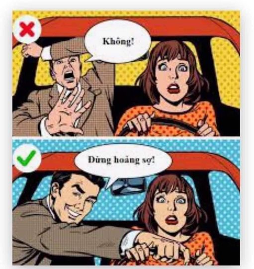 Tôi bảo: “Dây an toàn của ghế lái nó ở bên tay trái chị ạ! Còn cái dây chị đang cầm là dây của ghế phụ, không thể quàng cái dây đó qua người chị được đâu!”