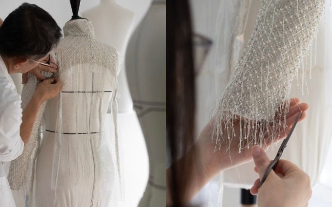 Danh ca Celine Dion diện bộ váy tua rua của Dior mất hơn 41 ngày thực hiện, trong lễ khai mạc Olympic.