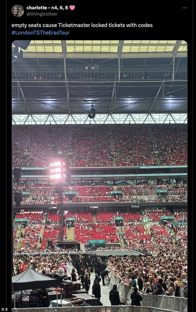 Đó không phải sự cố duy nhất trong đêm diễn. Trên X, người hâm mộ chia sẻ hình ảnh chụp bên trong sân Wembley cho thấy có nhiều hàng ghế trống. Đây là điều chưa bao giờ xảy ra trước đó, không chỉ bên trong kín chỗ mà còn có hàng nghìn người nghe ké bên ngoài. Vì lý do an ninh, sân Wembley cấm người hâm mộ tụ tập bên ngoài. Tuy nhiên, việc thừa chỗ bên trong khiến cư dân mạng khó hiểu.